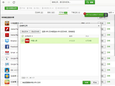 启动手机应用管理软件(例如豌豆荚),并将手机连接电脑,通过"安装新应用"功能完成安装。