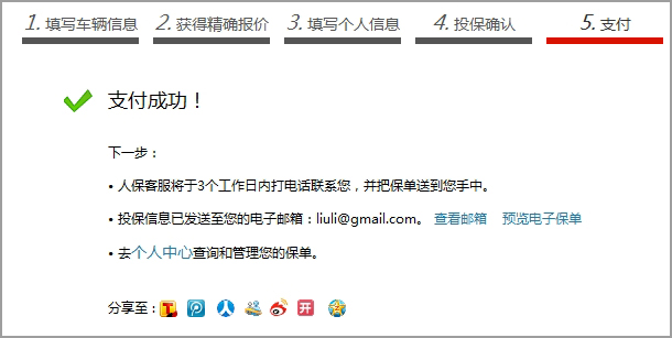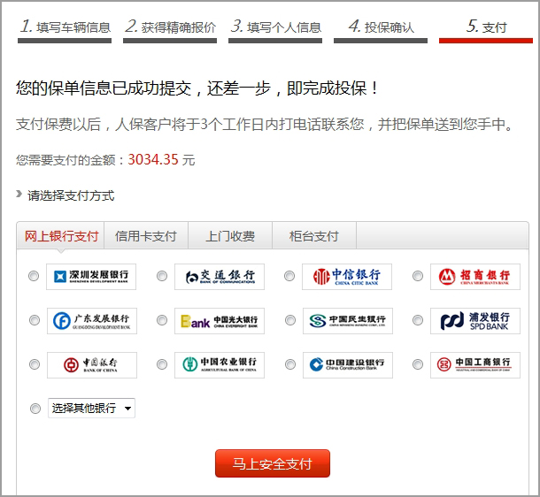 第一步:确认投保信息后,点击“确定”按钮,进入支付页面。