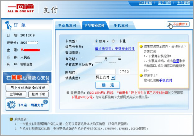第三步:请在打开的对应银行页面(以招商银行为例)准确填写借记卡号、支付密码等信息,确认后提交。