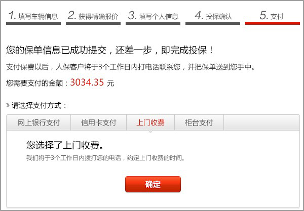 第一步:确认投保信息后,点击“确定”按钮,进入支付页面。