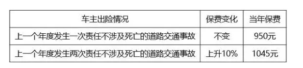 以一般家庭常用的5座轿车为例,交强险基础保费950元,那么在发生互碰自赔报保险的情况下保费变化如下:
